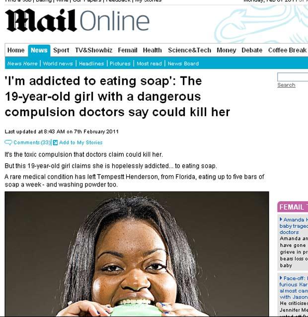 19/02/2011 21:51A americana Tempestt Henderson, de 19 anos, que mora na Flórida (EUA), tem um estranho vício. A jovem tem compulsão por comer sabão, tanto em barra quanto em pó. De acordo com o jornal inglês "Daily Mail", Tempestt devora até cinco barras de sabão por semana.